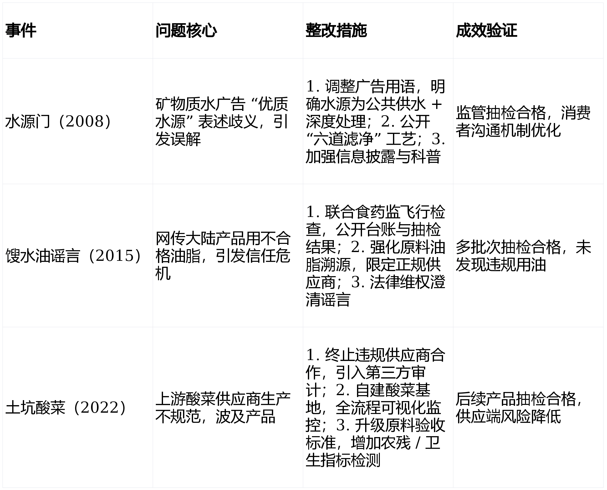 康师傅控股食物平安管控以 “三道防地 + 全流程 HACCP” 为焦点,笼盖泉源、出产、成品、逃溯全链条,环节环节包罗供应商分级、过程 CCP 、数字化逃溯取尝试室检测;过往质量问题多聚焦供应链取消息披露,强化溯源、通明化沟通为从,成效经监管抽检取系统认证验证(截至 2026 年 1 月 11 日)。